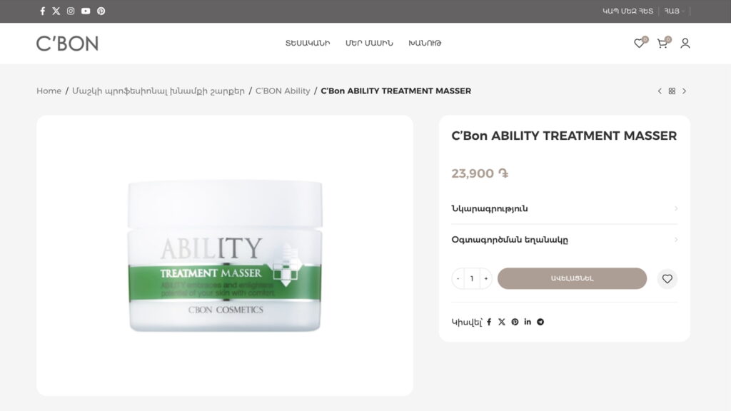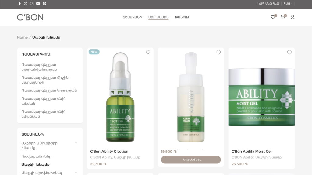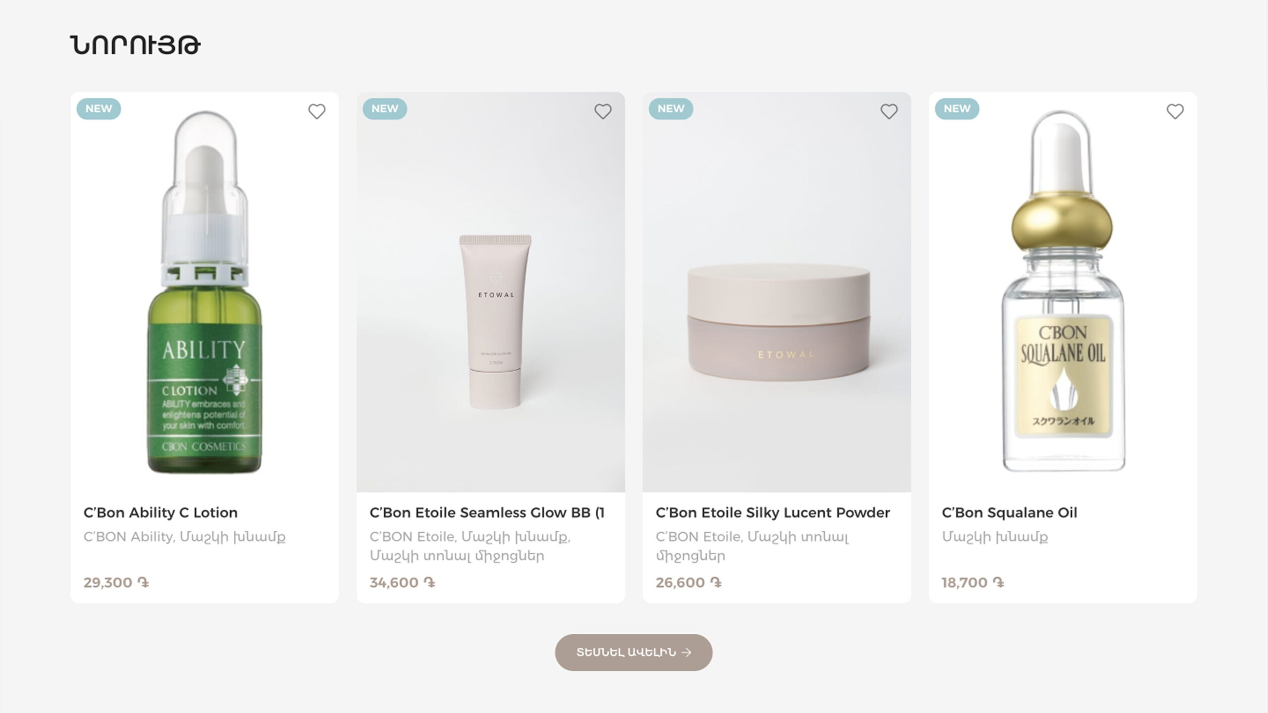CBON.am is a modern e-commerce platform dedicated to importing and selling high-quality skin care products aimed at maintaining beauty and healthy skin. The company is the official representative of the renowned Japanese brand C’bon in Armenia. Their offerings focus on safe, effective and modern care products that have undergone strict laboratory tests and meet high international quality standards.